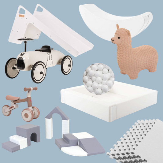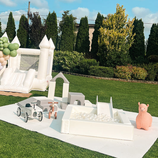 Balta bērnu rotaļu zona ar bumbiņu baseinu, Iglu klučiem un braucamajiem - noma