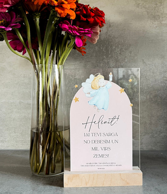 Stikla dekors ar bērna vārdiņu, dzimšanas datiem un vēlējuma tekstu