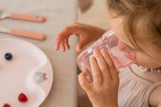 Vaikiškas stiklinis puodelis,Children's glass Flowers & Butterfly, rožiniai, Little Dutch