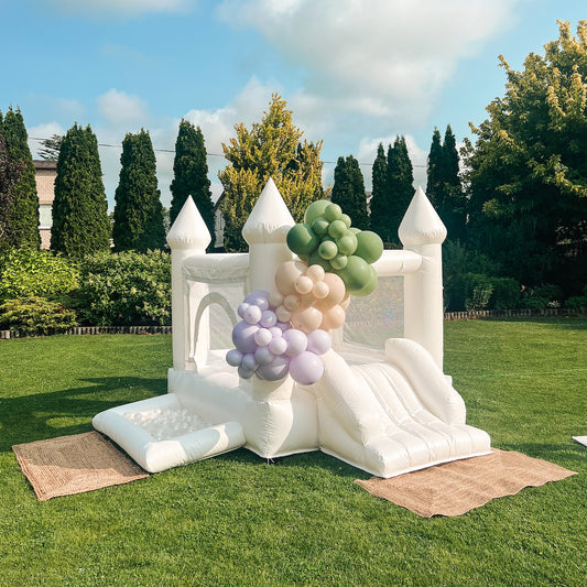 Pripučiama pilis, balta maža pilis su kamuoliukų baseinu 1,8 m - pripučiamų atrakcionų nuoma