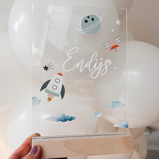 Erdvė - Dekoras su vaiko vardu ir gimimo duomenimis, stiklas