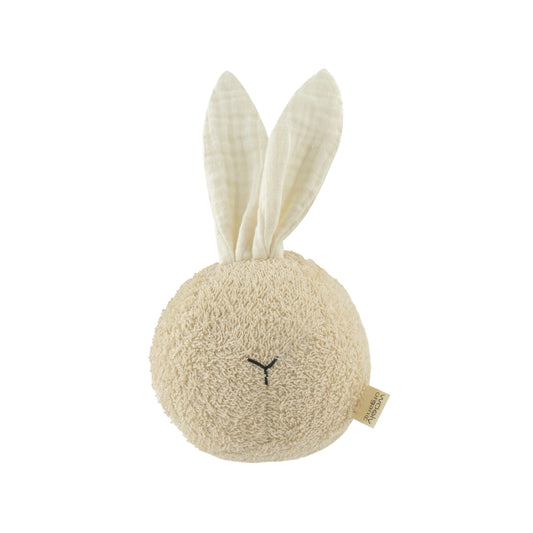Žaislinis zuikutis barškutis su kramtuku, vilnonis ekologiškas