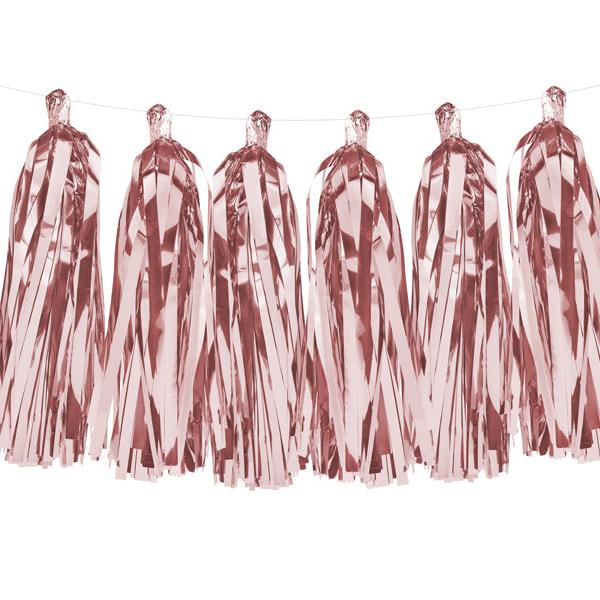 Party Deco pušķīšu virtene Tassel Garland rozā zeltā krāsā būs superīgs aksesuārs jūsu svētkiem. Stipriniet to pie sienas, griestiem vai baloniem un radiet svētku atmosfēru jebkur!